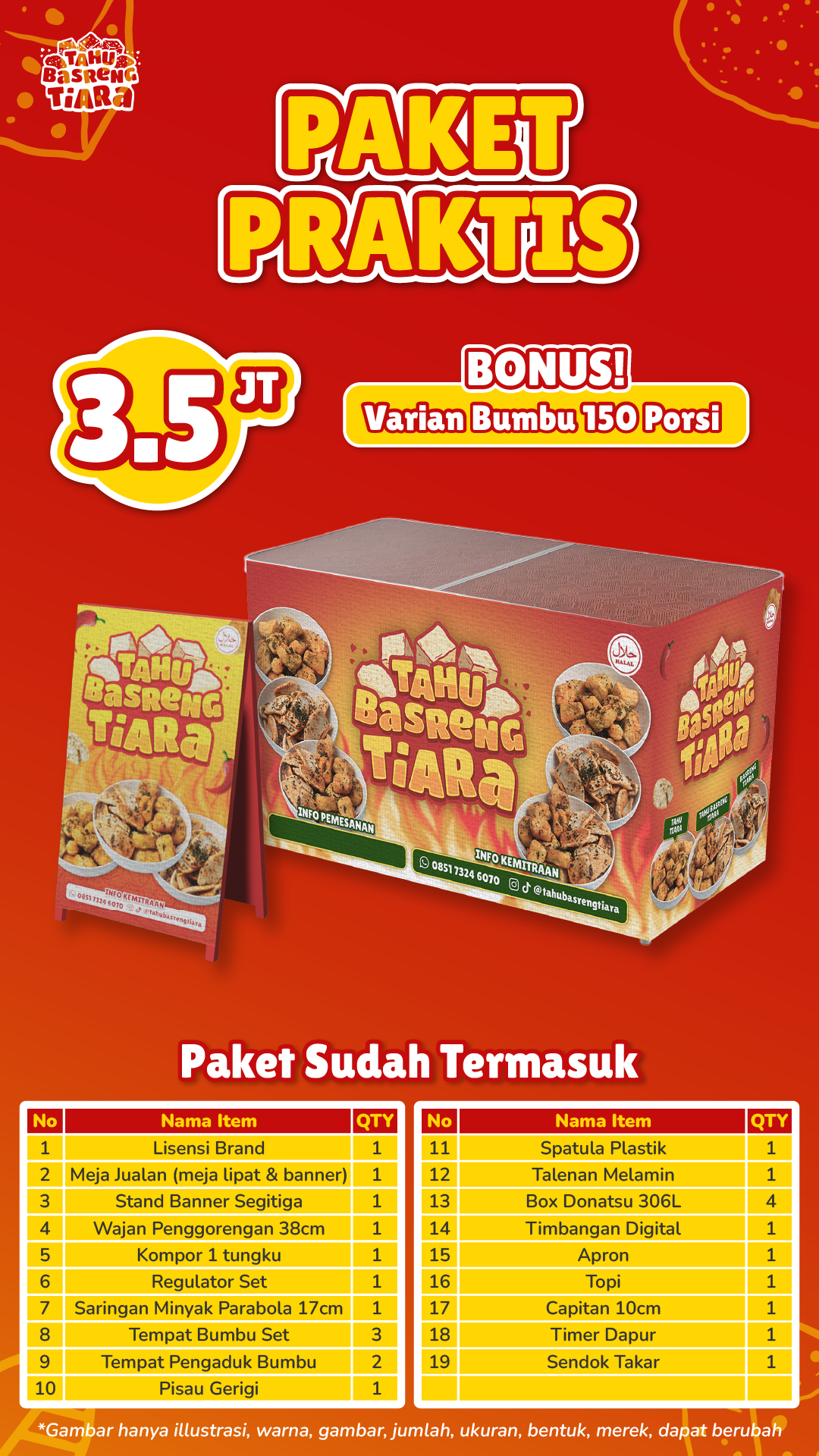 • Paket Praktis: Rp3,5 juta – sudah termasuk 50 porsi basreng dan bumbu.